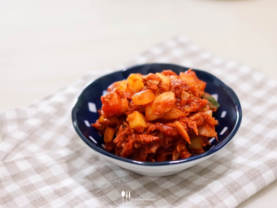 Finally, add the minced Korean green chili peppers and give everything one last quick stir to combine. Your flavorful spicy and sweet tuna and vegetable stir-fry is ready! Serve it warm over rice or enjoy it as a delightful accompaniment to your favorite beverage.