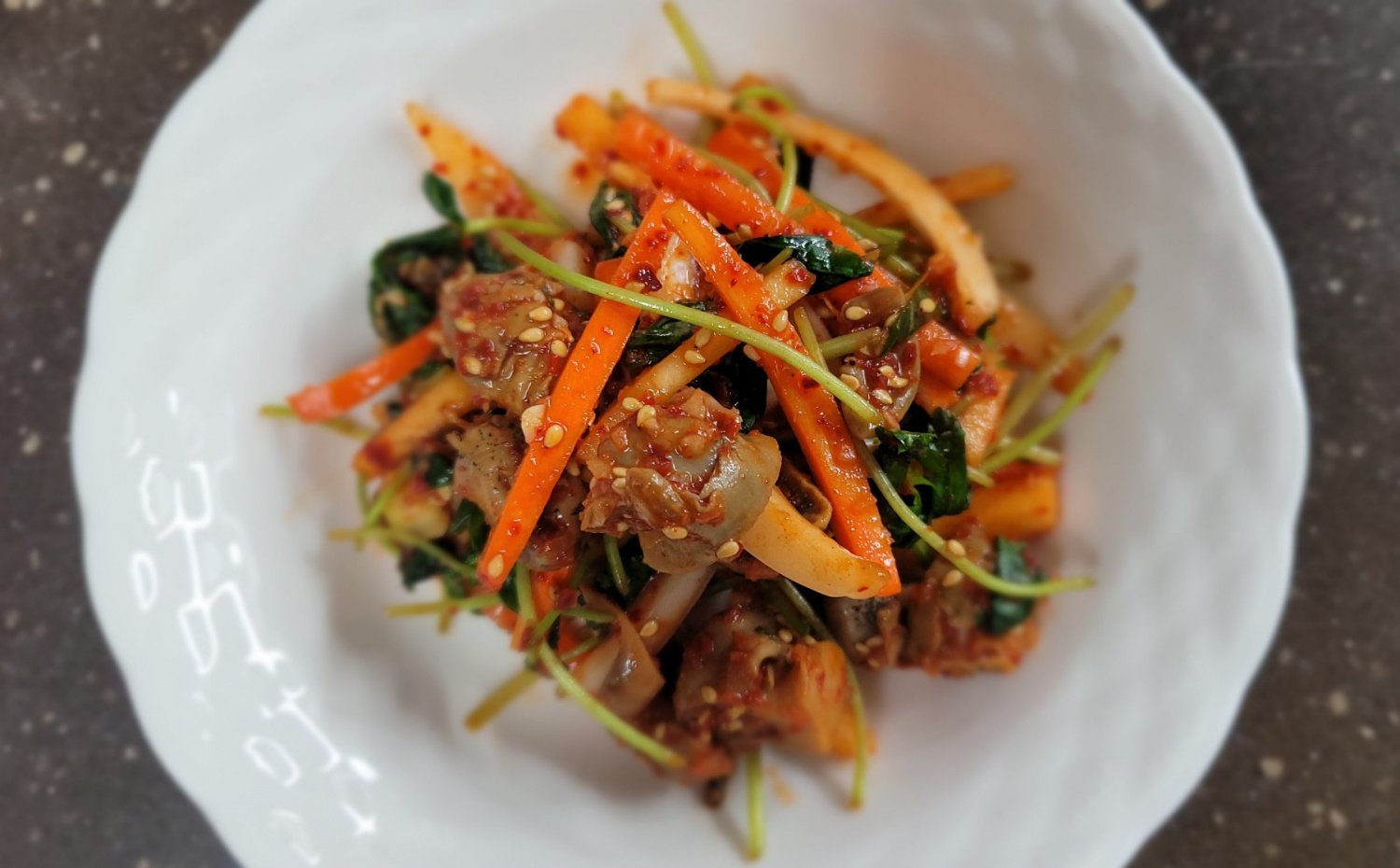 Now it’s time to combine everything! In a large mixing bowl, add the prepared aster greens, julienned carrot, onion, apple, and scallops. Prepare the dressing by adding the finely chopped green onion, minced garlic, gochugaru, soy sauce, plum extract (or sugar), vinegar, and sesame oil to the bowl. Gently mix all the ingredients together with your hands or a spatula, ensuring the dressing coats everything evenly. Be careful not to overmix, as this can make the aster greens mushy.