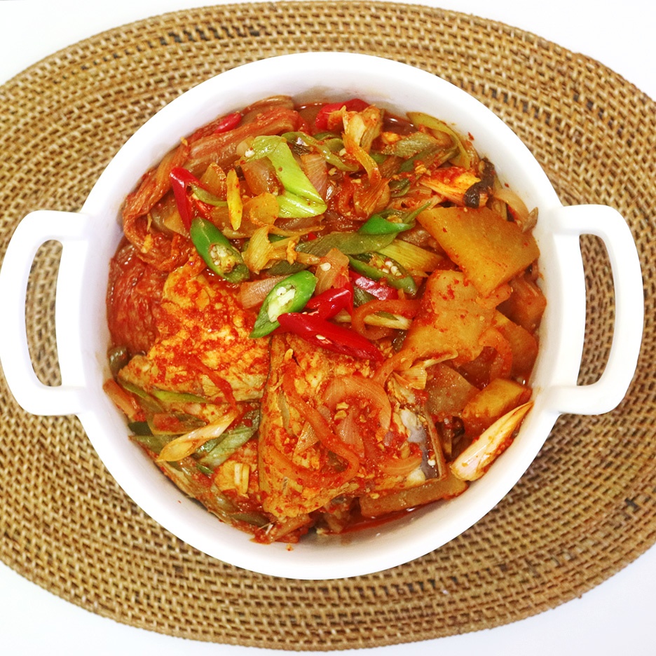 * **Main Ingredients:** 1/4 head of well-fermented kimchi, 1/2 fresh mackerel (or 1 can of canned mackerel), 1 stalk of green onion, 2 Korean chili peppers, 1 red chili pepper, 1/4 radish, 1/2 onion, water.