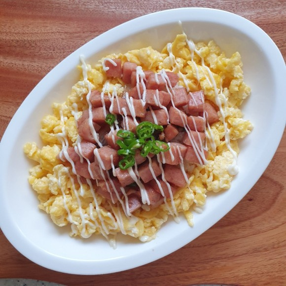 Gather your ingredients: 200g of Spam (one can), 2 eggs, half an onion, and 2 Cheongyang peppers. Prepare 1 bowl of warm cooked rice. (You can increase the rice portion to 1.5 bowls if you prefer.)