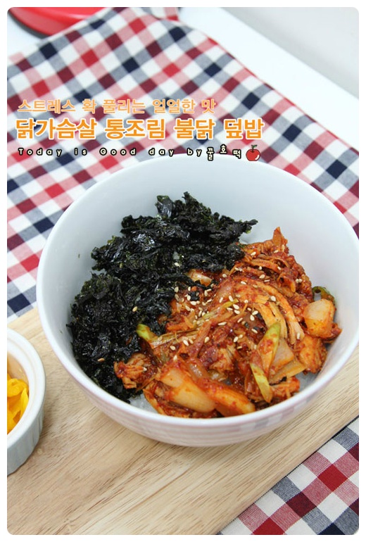 Finally, sprinkle a handful of roasted seaweed flakes (gim-jaban) over the top. Your delicious Spicy Chicken Stir-fry Rice Bowl is now complete! Enjoy this satisfying and flavorful one-bowl meal. 🙂