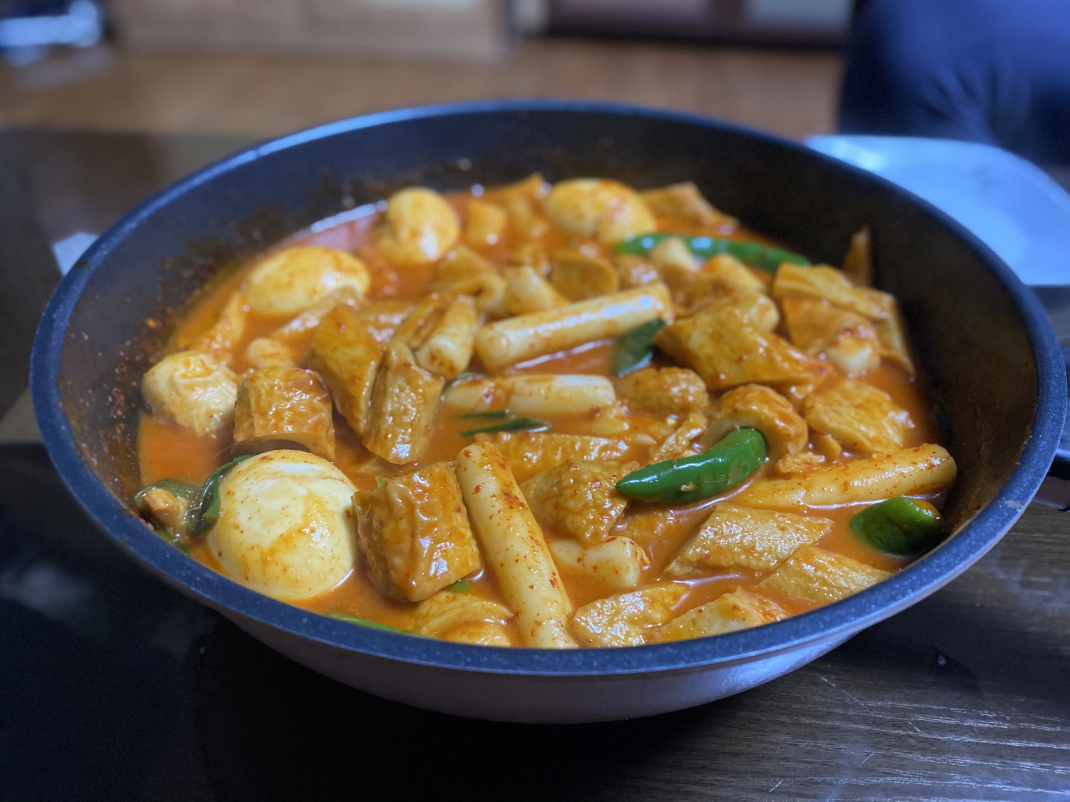 Continue to boil for about 5 more minutes after adding the fish cakes. Finally, add the hard-boiled eggs, sliced leeks, and the roughly chopped Cheongyang chili peppers. (Include the chili peppers if you like it spicy; omit or remove the seeds if serving to children.) Simmer for another 3 minutes to allow the flavors to meld and the sauce to thicken slightly. Your delicious tteokbokki is ready! Tip: The leftover sauce is perfect for cooking ramen noodles, so be sure to try it!