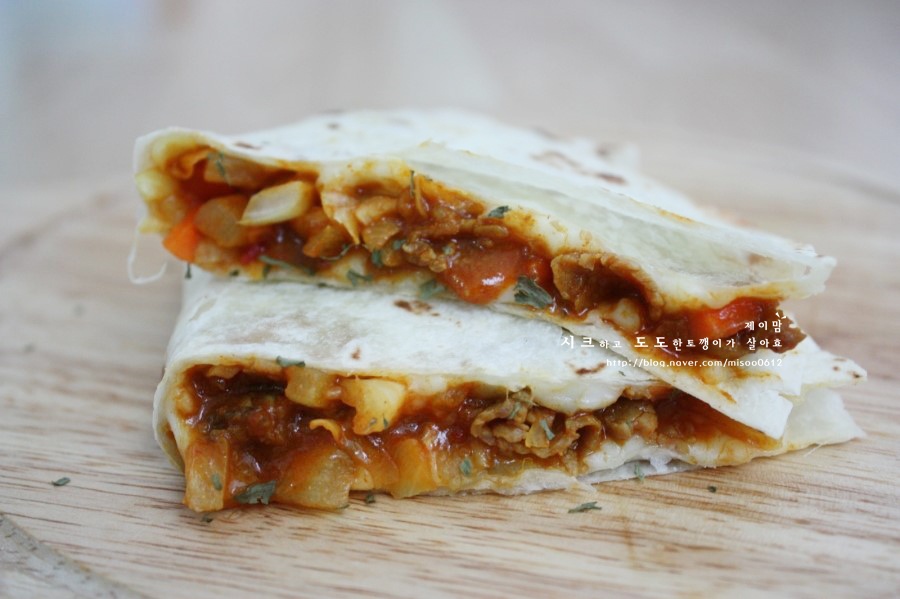 Spread half of the cooked spicy bulgogi filling evenly over the cheese on one half of the tortilla. Don’t overfill, or it will be difficult to fold.