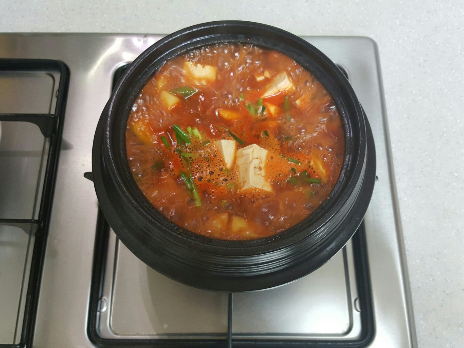 Finally, add the diagonally sliced green onion and cubed tofu to the stew. Gently stir to combine without breaking the tofu. Bring it back to a brief boil until everything is heated through. A pinch of black pepper can be added for extra aroma. Your delicious and spicy Gochujang Tofu Stew is ready to be enjoyed! ♡