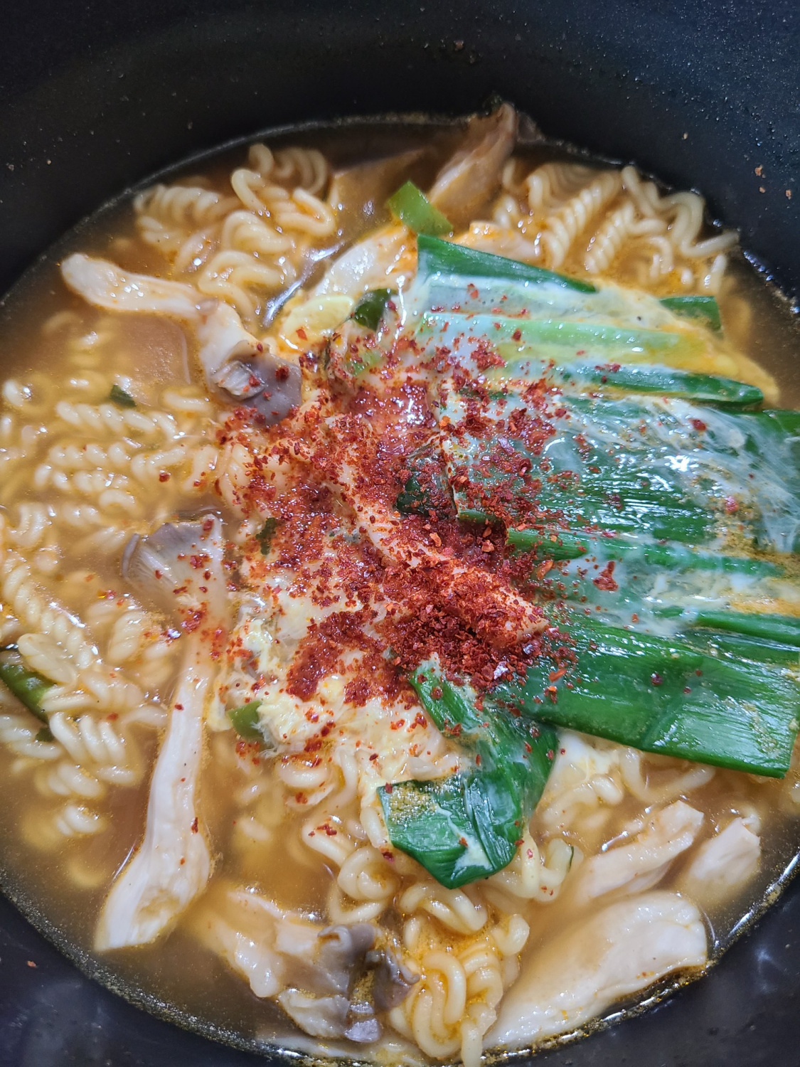 Finally, after boiling for one more minute, stir in 1 teaspoon of sun-dried chili flakes (Gochugaru) and mix well with the broth. Your flavorful and spicy King Oyster Mushroom Ramyeon is ready to be enjoyed! Serve hot.