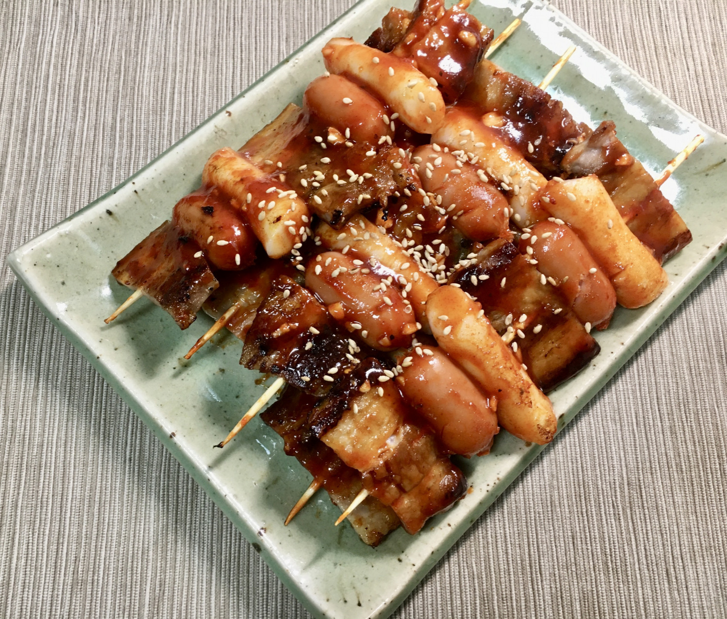 A delightful skewer treat featuring savory pork belly, chewy rice cakes, and plump Vienna sausages, all coated in a mouthwatering spicy and sweet sauce. It’s a perfect snack with a fantastic blend of textures and flavors.