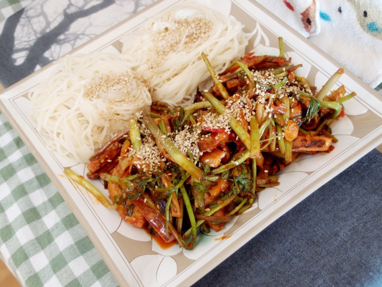 Voila! Your appetizing Ojing-eo Cho Muchim is ready. It’s surprisingly chewy and delicious, you wouldn’t guess it’s made with frozen squid. The fresh aroma of water parsley and the crisp texture of the vegetables create a truly delightful dish.