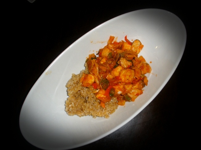 Serve the generously portioned spicy tofu and mushroom dish over hot rice. Enjoy mixing and eating!