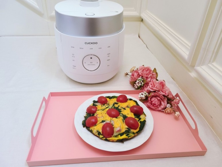 Did you know you could make such a wonderful dish in a rice cooker? Using the Cuckoo Twin Pressure cooker’s ‘Normal Pressure’ mode and ‘Open Cooking’ feature, you can easily create a nutritious and delicious spinach frittata. The Normal Pressure steam function gently cooks the ingredients, while the Open Cooking feature perfectly preserves the fresh texture and vibrant taste of cherry tomatoes. This recipe is a fantastic way to prepare a special brunch or meal with just one appliance.
