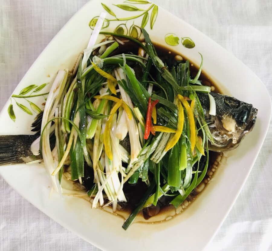Transfer the steamed fish: Carefully remove the steamed rockfish and the steamed scallions from the steamer and arrange them on a serving plate. Handle the fish gently to prevent it from breaking apart. Placing the steamed scallions underneath the fish on the plate can add an extra layer of flavor.