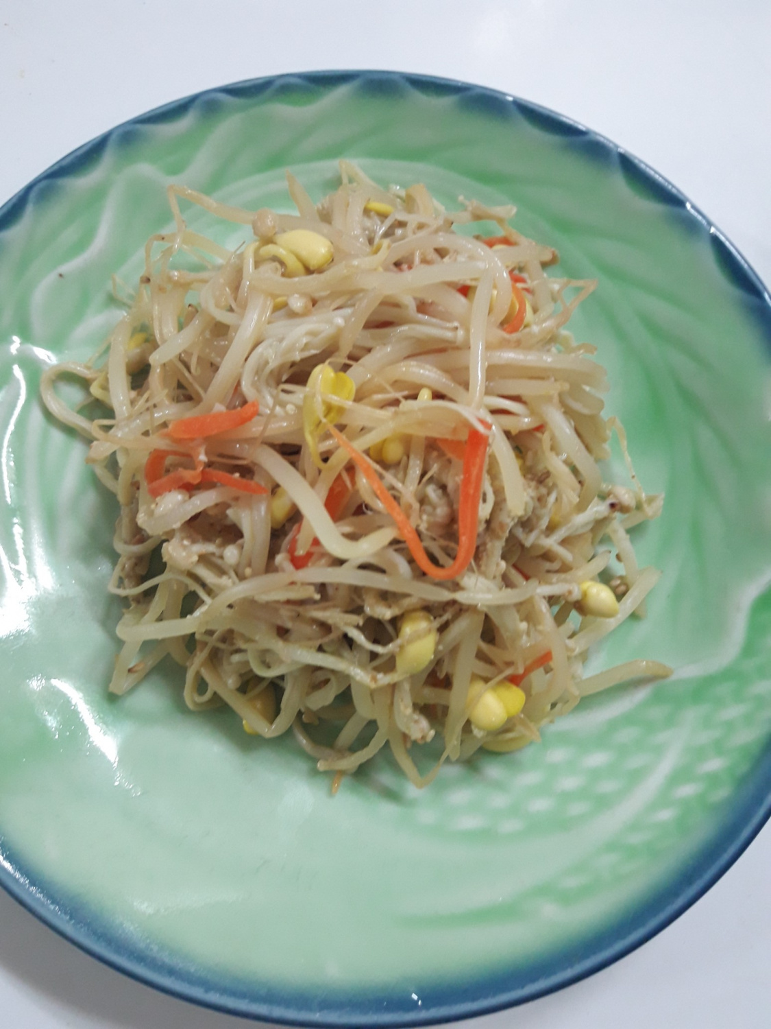 Thinly julienne the carrot for a pop of color. Trim the base of the enoki mushrooms and then tear them apart into smaller clusters. Tearing the mushrooms helps them absorb more seasoning and improves their texture. Add the prepared carrots and enoki mushrooms on top of the bean sprouts.