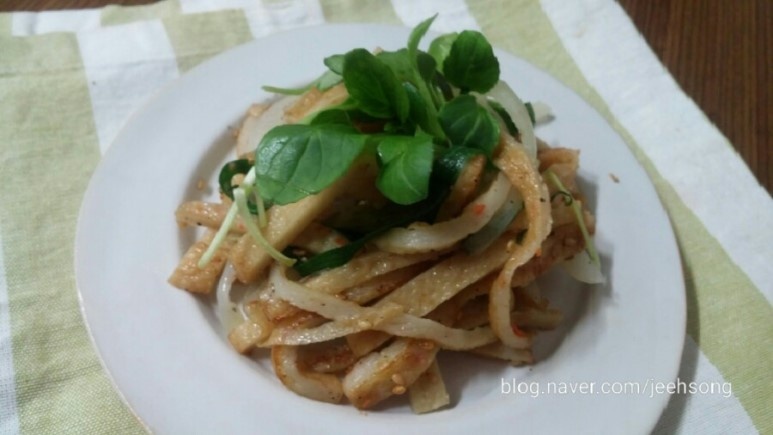 Once the green onions and onions have softened and become translucent, add the fish cakes that have been cut into thin strips. Stir-fry them together, making sure to toss them frequently to prevent sticking.