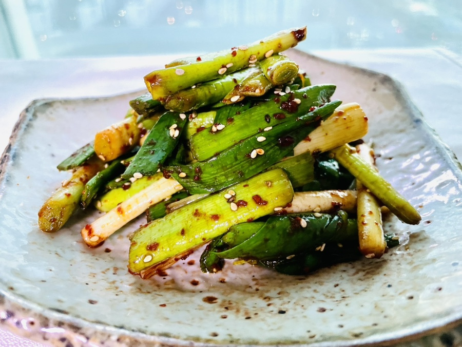 Growing up, my parents farmed garlic, so my childhood was filled with fields of it. Yet, I never actually cooked dishes like stir-fried garlic scapes. Every time I see them prepared, I find it fascinating! Since garlic was so common, I always wondered why my mom didn’t make them. My first encounter with this dish was recently at a restaurant. It was so delicious that I even asked for a refill! Inspired by that flavor, I bought a bunch of garlic scapes today to recreate the dish. It’s a simple recipe: just blanch them lightly and toss with seasoning. When mixed with this refreshing dressing, it feels like every tiny taste bud on my tongue awakens from its winter slumber, just like newly sprouting spring greens.