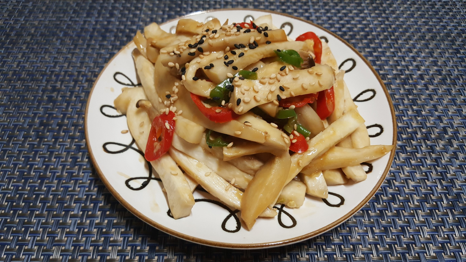 Turn up the heat to high and stir-fry quickly until the liquid has evaporated. Sprinkle with toasted sesame seeds at the end for a more appetizing finish. Your delicious stir-fried king oyster mushrooms are ready!
