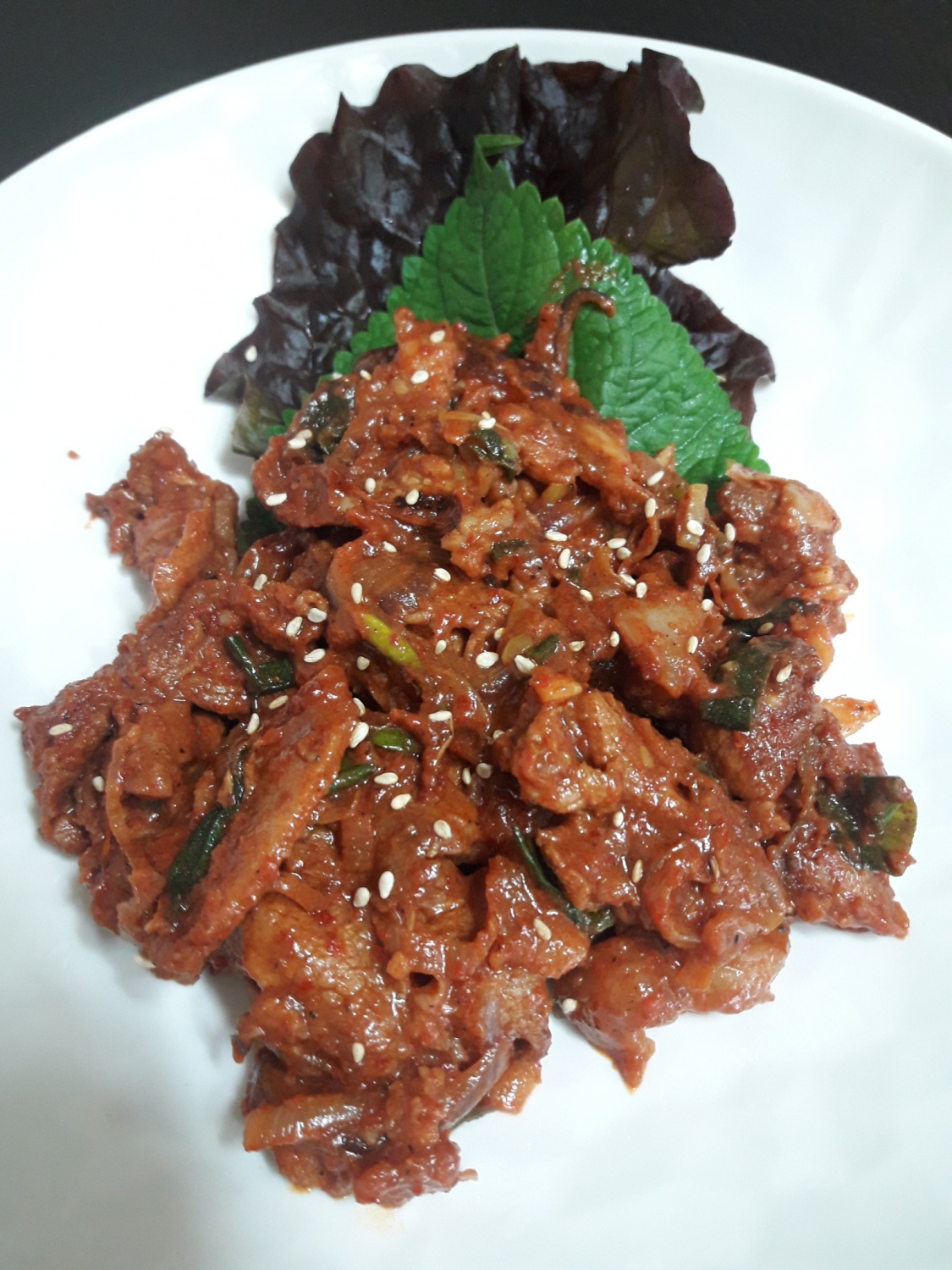 The finished Jeyuk Bokkeum will have a vibrant, appetizing reddish hue and a tantalizing aroma. It looks absolutely delicious! Serve it with fresh lettuce wraps, rice, or as a delightful side dish.