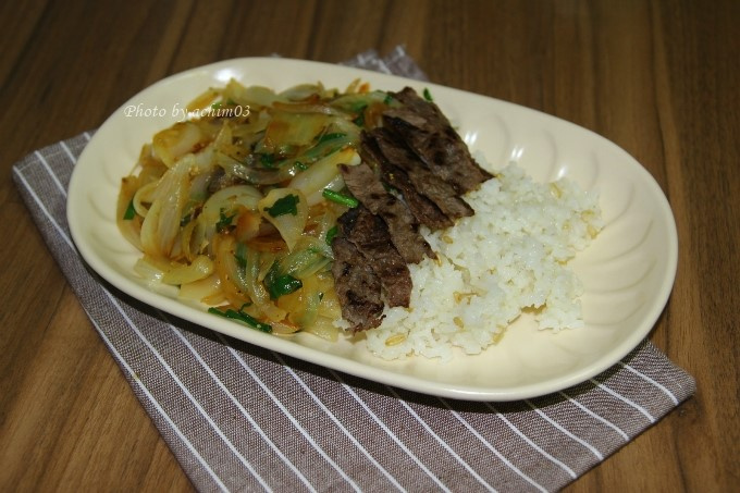 Since this is a rice bowl, let’s prepare some beef to go with it! Lightly season some beef with salt and pepper, then pan-fry it until golden brown. Once cooked, slice the beef into bite-sized pieces. Are you worried that it might not be a proper ‘rice bowl’ without a sauce? Don’t worry at all! The moisture and sweetness released from the well-cooked onions will combine with the rice, creating a wonderfully moist and flavorful rice bowl. One bite will have you captivated by its delicious sweetness.