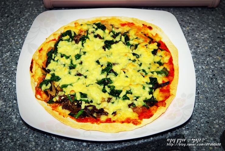 This is a tortilla pizza made with leftover je-sa namul! It’s a fantastic way to use up any extra seasoned vegetables from ancestral rites or simply clear out your fridge. Expect a surprisingly delicious result that perfectly complements the cheese and tortilla.