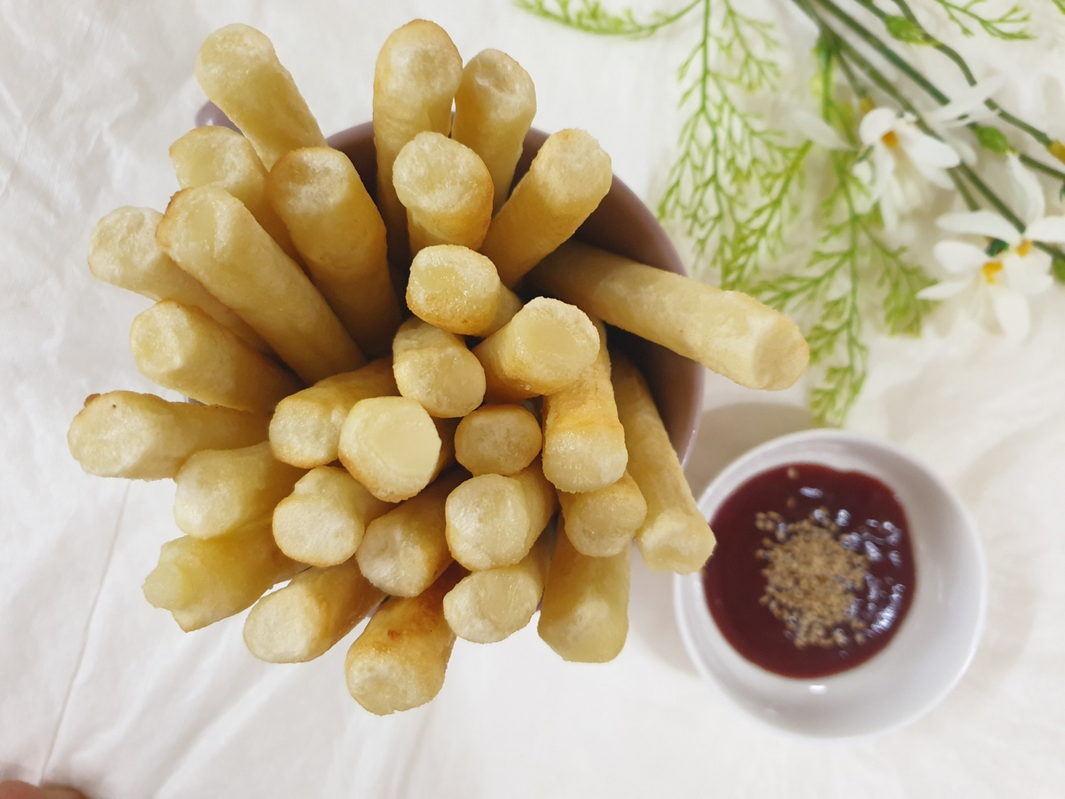 In a small bowl, combine 2 Tbsp ketchup, 1 Tbsp soy sauce, 3 Tbsp corn syrup, and 1 tsp gochujang. Mix well to create the tteokkochi sauce. Add the fried tteok to the pan, pour the sauce over them, and simmer over low heat. Stir gently for about 1-2 minutes until the sauce coats the tteok evenly.