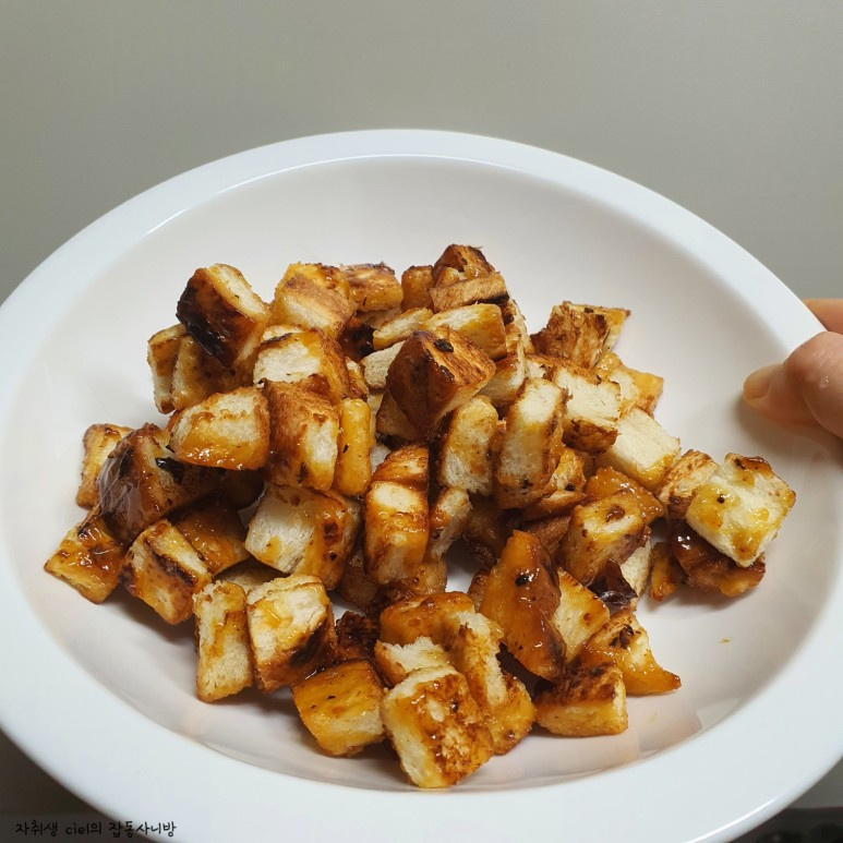 Now, it’s time to dry out the bread and make it crispy. Use a dry pan without any oil and heat it over medium-low heat. Once the pan is warm, add the bread cubes and toast them on both sides until they are lightly golden. This process will remove moisture, making them extra crunchy. Be careful not to burn them; just toast them lightly.