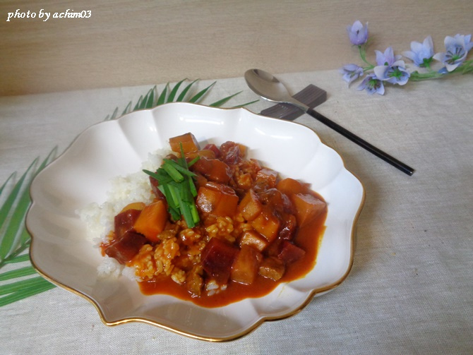Enjoy a satisfying curry without the need for multiple side dishes. Today, we’re making a ‘fridge-cleaning’ meal! Featuring sweet potatoes as the star, we’ve added beets, onions, and delicious beef to create a rich and flavorful curry in a flash. This dish is perfect as a snack for kids or a hearty dinner.