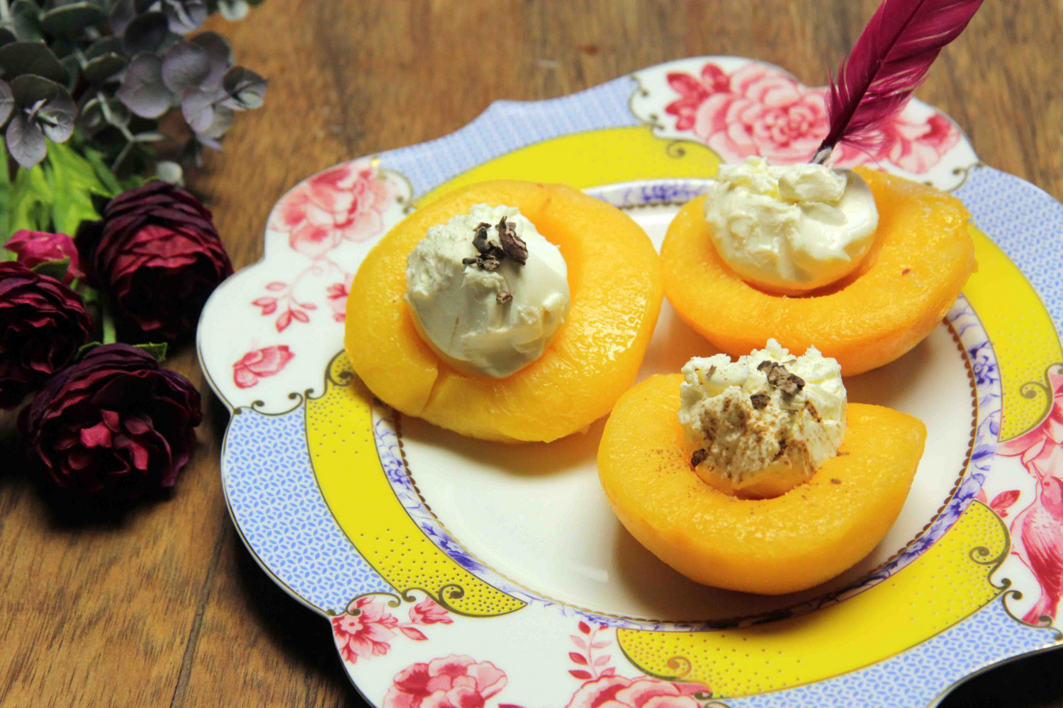 Finally, generously top the slightly cooled peach slices with the softened cream cheese you prepared. You can adjust the amount of cream cheese according to your preference. And just like that, your simple yet elegant Peach Cream Cheese Balls are ready!