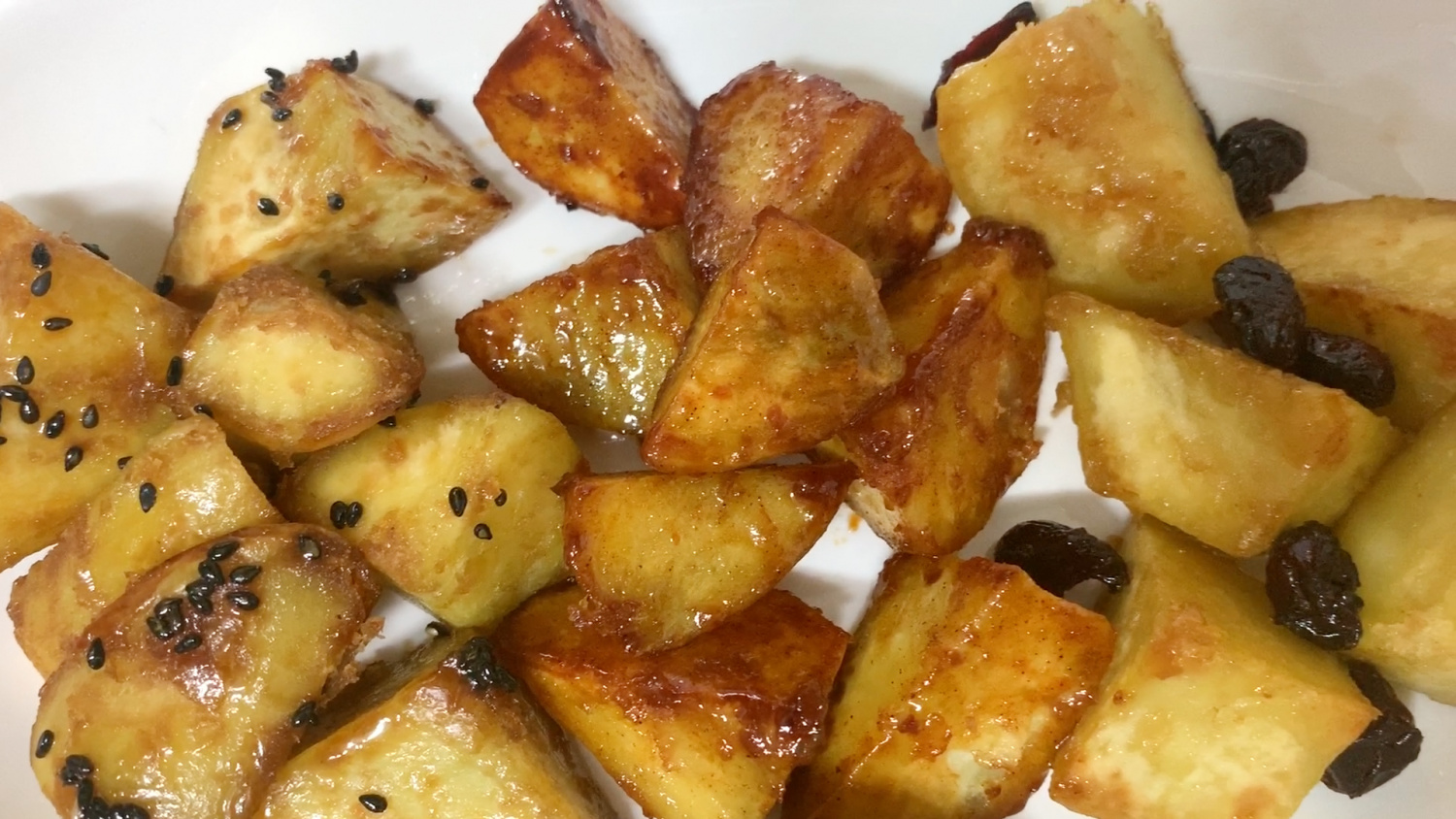 When the syrup has reduced and coats the sweet potatoes beautifully, turn off the heat. Sprinkle the roasted black sesame seeds over the top and give it a gentle toss to combine. Your delicious black sesame Matang is ready!