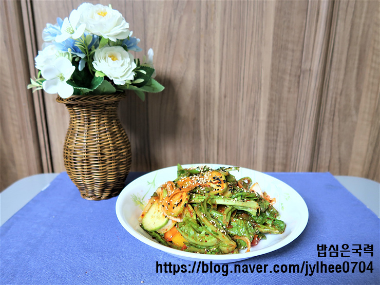 First, add 1 Tbsp of gochugaru, 1 Tbsp of freshly ground sesame seeds, and 1 Tbsp of sesame oil to the vegetables. Gently toss them together. This step helps maintain the crispness of the vegetables while adding flavor. Finally, add 1.5 Tbsp of gochujang and toss lightly. Adding the gochujang just before serving is key to preventing the vegetables from wilting and ensuring they stay fresh and delicious.