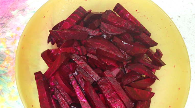 Once the beets are clean, slice them into bite-sized pieces. Cutting them into long, thin strips is ideal if you plan to use them in kimbap or as salad toppings, as it makes them versatile and easy to handle.