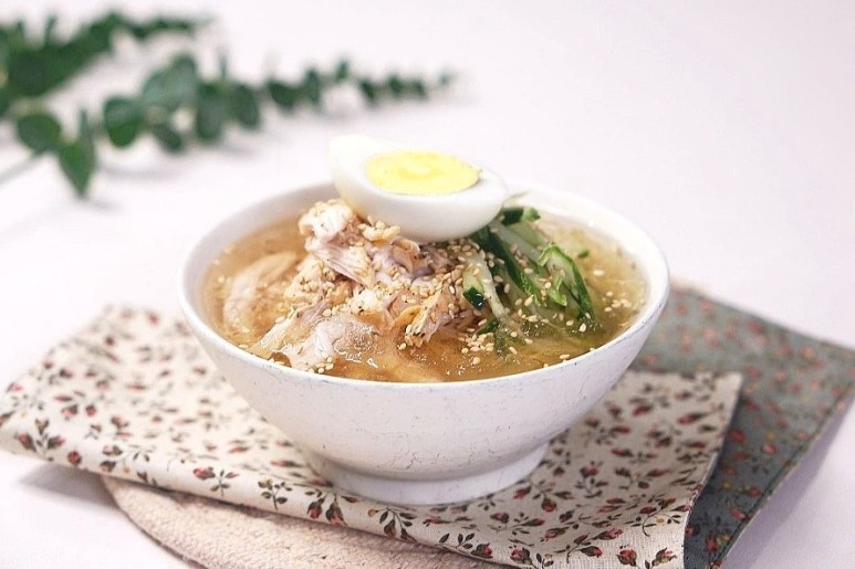 Your delicious Chogye Guksu is ready! Enjoy the refreshing combination of tangy mustard sauce, tender chicken, and icy broth. Perfect for a satisfying and cooling meal!