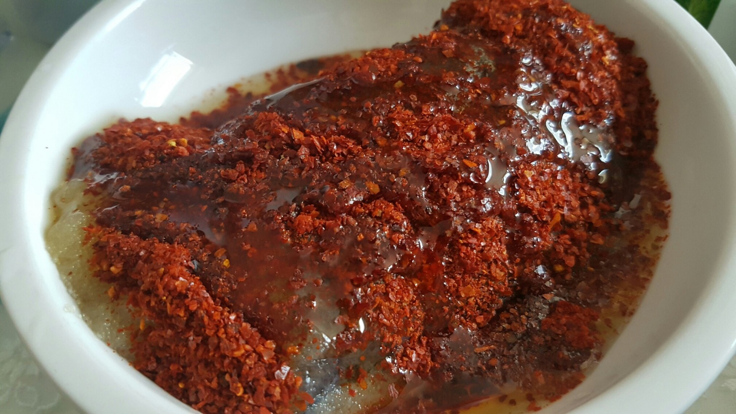 Once the gochugaru is well mixed, drizzle in 2 tablespoons of sesame oil to add a wonderful aroma and flavor. The nutty scent of sesame oil will complement the roe beautifully. Mix gently again to ensure the seasoning is evenly distributed.
