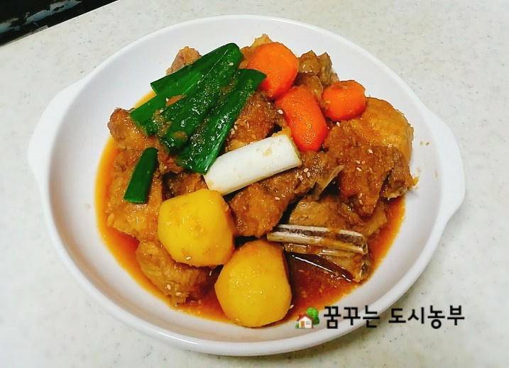 When the potatoes and carrots are almost cooked through, stir in the oligodang (corn syrup) and cook until the sauce thickens to a desired consistency. Finally, add the large pieces of green onion and sprinkle with sesame seeds for a beautiful garnish. Your delicious braised pork ribs are ready!