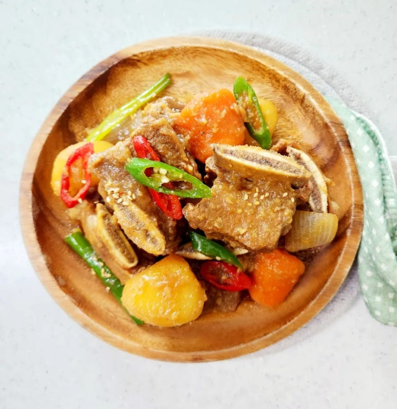 Rinse the beef short ribs (1kg) under running water once. Place them in a large bowl, cover with enough cold water to submerge the ribs, and add 1 tablespoon of sugar. Let them soak for about 1 hour to remove excess blood. The sugar helps to draw out the blood and impurities, minimizing any gamey odor.