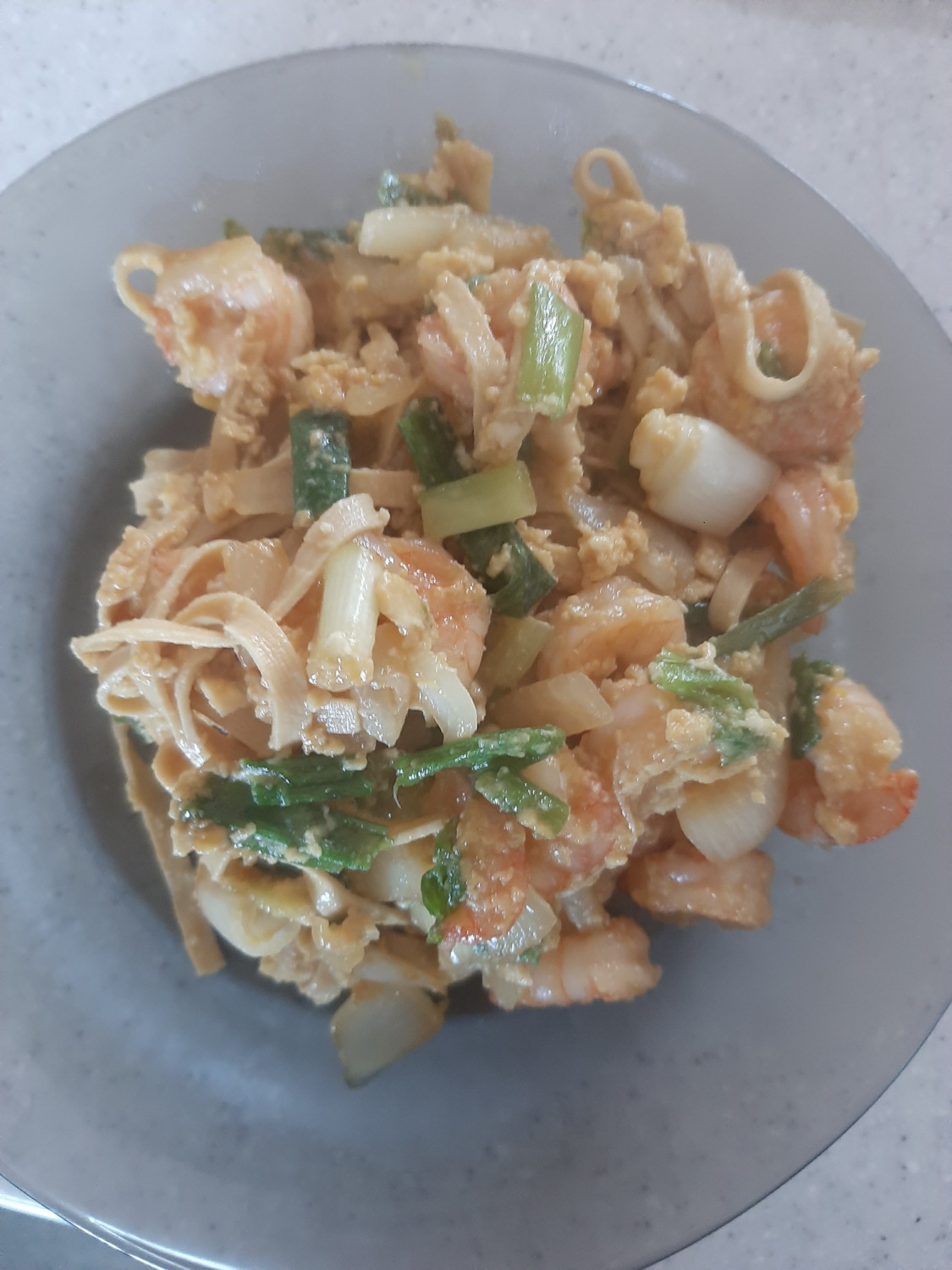 First, melt 1 tablespoon of unsalted butter in a frying pan over medium heat. Once the butter is melted, add the frozen shrimp and cook until they turn pink and slightly golden. When the shrimp are almost cooked through, add thinly sliced scallions or chopped onion and sauté together until fragrant. Cook until the vegetables become translucent.