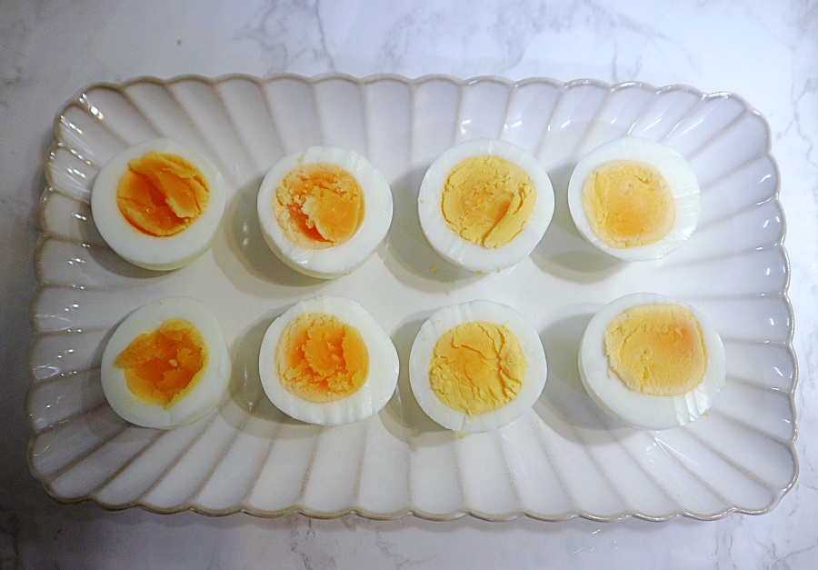 I’ve arranged the peeled eggs, boiled for varying times, on a pretty plate. It’s convenient to visually see the different levels of doneness.