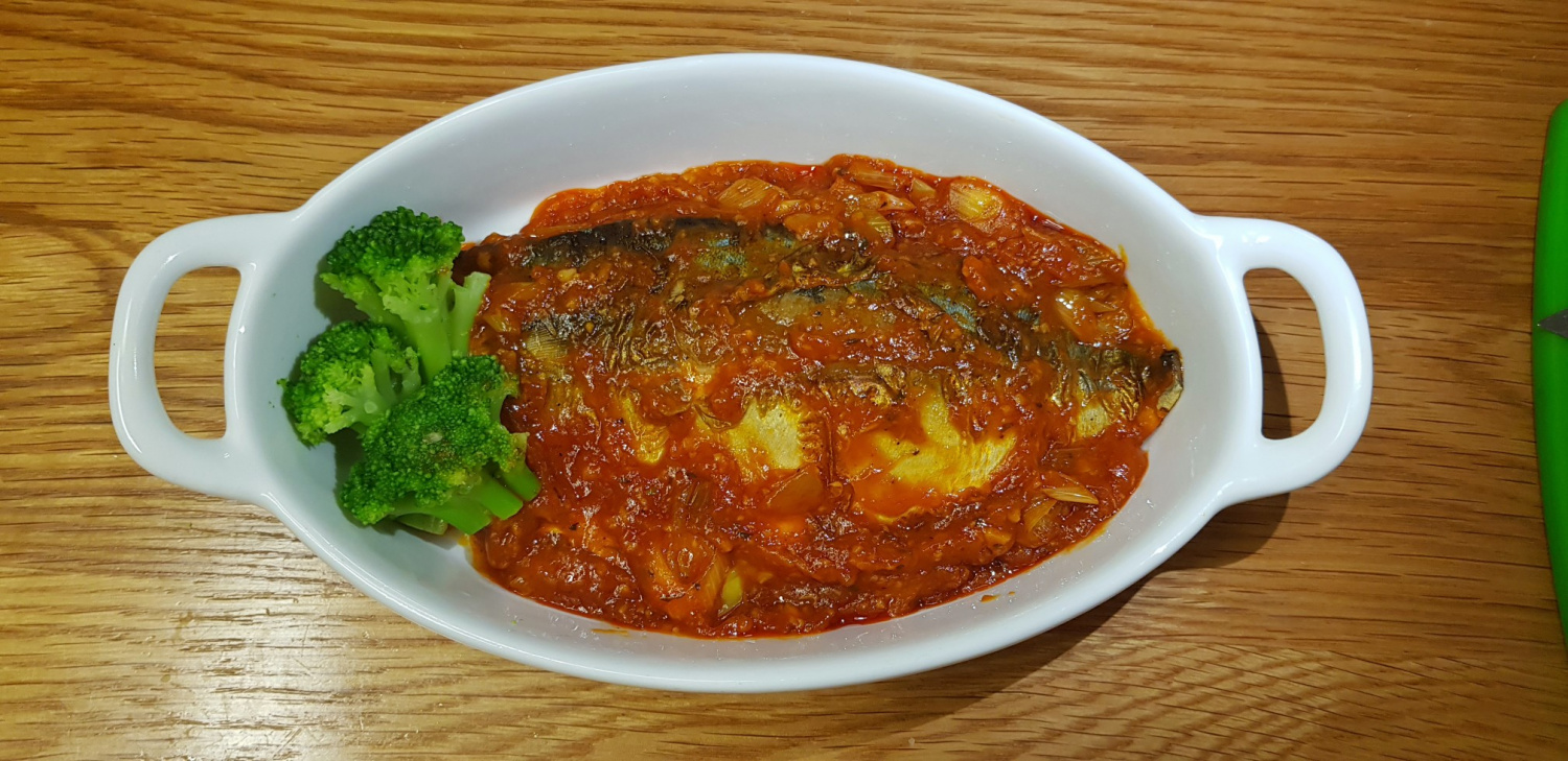 When the sauce has thickened slightly and coats the fish beautifully, turn off the heat. Serve the mackerel on a plate, arranging the blanched broccoli on the side. Dipping the broccoli into the Arrabiata sauce is highly recommended for an extra burst of flavor. Your unique and delicious meal is ready!