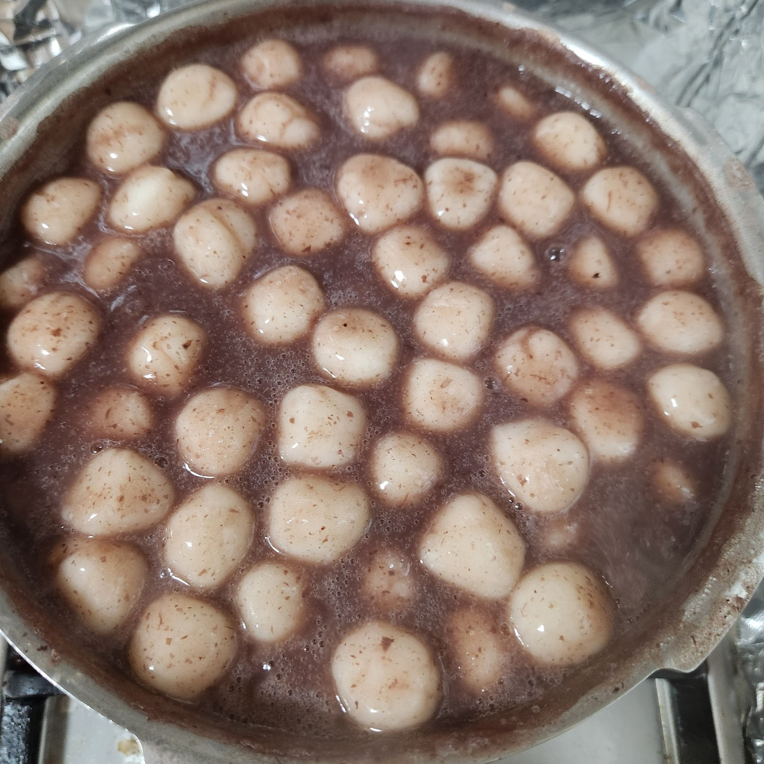 When the red bean liquid is boiling vigorously, carefully add the 700g of frozen glutinous rice cakes (ongsimi).
