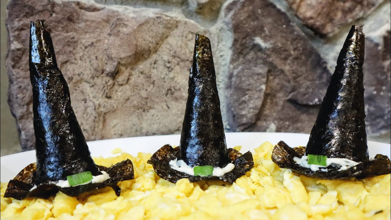 Finally, you can add a cute witch hat detail by finely chopping some green onion and dotting it onto the mayonnaise. (Optional)