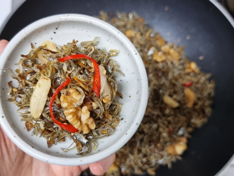 Mi hermana está embarazada y sufre de náuseas matutinas severas, así que decidí prepararle un plato nostálgico: anchoas pequeñas salteadas, crujientes y dulces, ¡como solía hacer mi madre! Debido a que las anchoas pequeñas (jiri-myeolchi) tienen un sabor salado intenso, me centré en la dulzura y logré la máxima crocancia sin usar salsa de soja. Añadí nueces y ajo para un sabor y textura equilibrados, junto con chiles rojos finamente cortados para dar un toque de color y frescura. ¡Este es un acompañamiento perfecto que también es un gran snack para los niños!