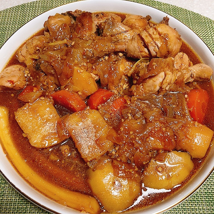 Seleccione una olla ancha y profunda. Coloque los trozos de pollo, que previamente ha hecho cortes, en el fondo de la olla. Luego, disponga las patatas, zanahorias y cebollas preparadas sobre el pollo. Finalmente, vierta la salsa preparada uniformemente sobre todos los ingredientes, permitiendo que la salsa comience a penetrar en ellos.
