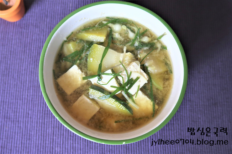Añade la calabaza picada, el tofu y las fragantes cebolletas salvajes al caldo de bonito preparado. Luego, disuelve 4 cucharadas de doenjang a través de un colador en la olla. Ajusta la cantidad de doenjang según su salinidad y tipo, y asegúrate de que esté bien disuelto para evitar grumos.