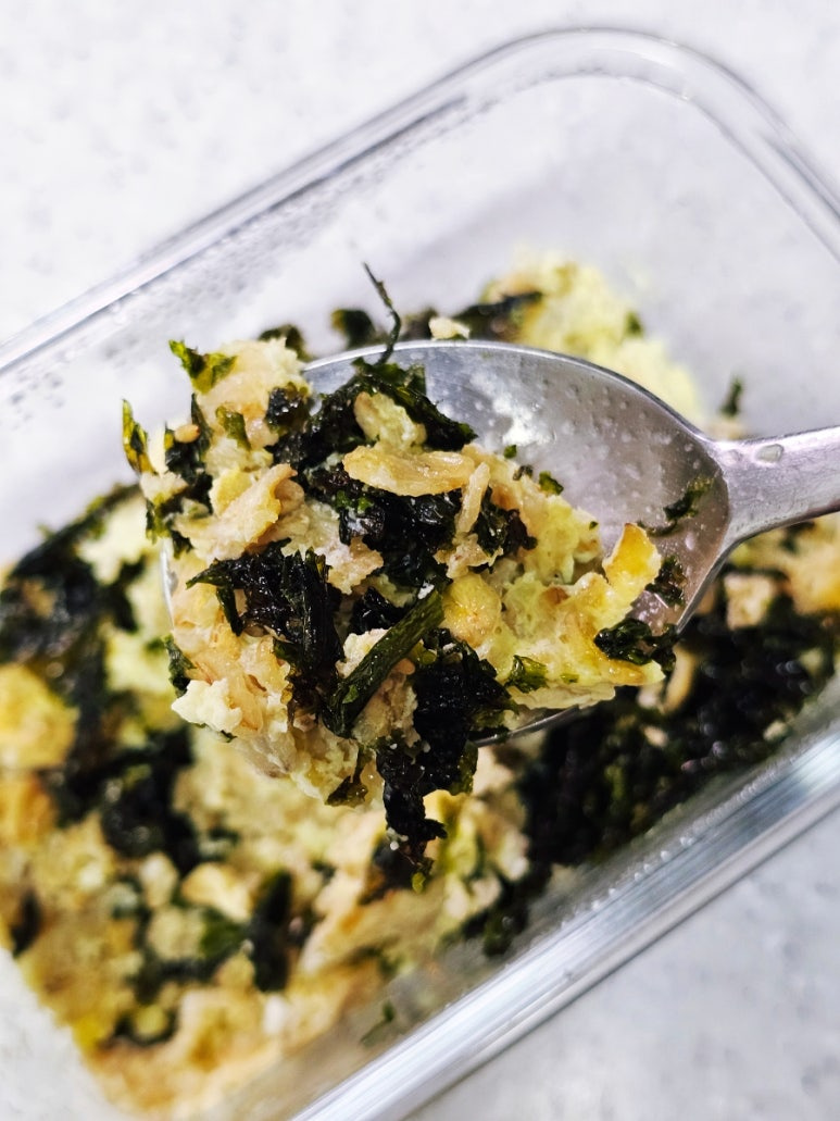 Finalmente, espolvorea generosamente una buena cantidad de crujientes y sabrosos copos de alga seca (Gimjaban) por encima. Revuelve todo con una cuchara para combinar. ¡Tu delicioso Arroz de Avena con Huevo está listo para disfrutar! Para un toque extra, puedes espolvorear algunas semillas de sésamo por encima.