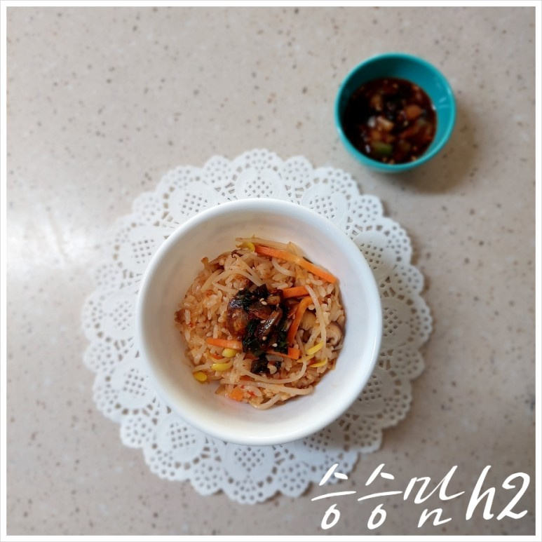 Después de 15 minutos, abre la arrocera y mezcla suavemente el arroz, las verduras y los brotes de soja con una espátula. ¡Tu delicioso arroz de kimchi con brotes de soja está listo! Sirve caliente, vertiendo la sabrosa salsa de condimento por encima y mezclándola. La combinación de kimchi picante, brotes de soja refrescantes y salsa sabrosa crea una comida verdaderamente deliciosa. ¡Disfruta de este plato sencillo pero especial!