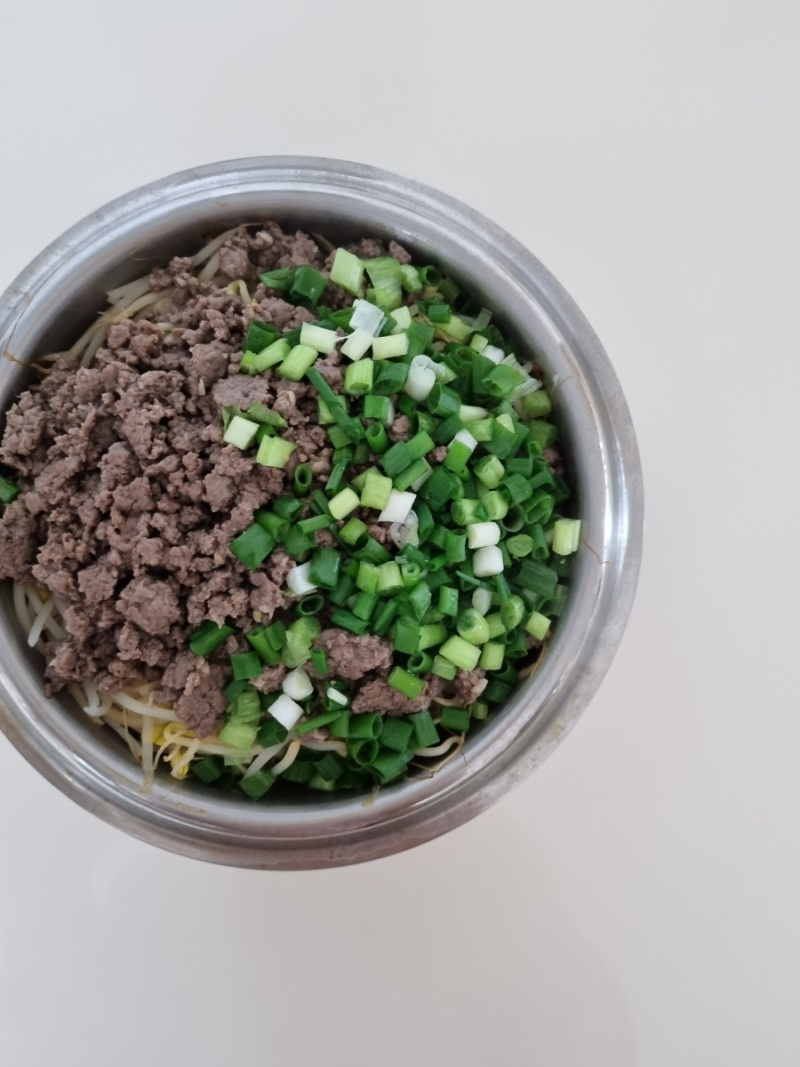 Después de 10 minutos, baja el fuego al mínimo o apágalo por completo. Coloca cuidadosamente la ternera salteada y las cebolletas picadas sobre el arroz. Tapa herméticamente y deja reposar durante 10 minutos. Este proceso de cocción al vapor resultará en granos de arroz perfectamente cocidos e ingredientes armoniosamente mezclados.