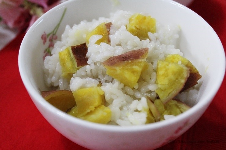 Agregue 1 taza de arroz a su arrocera y enjuáguelo bien. Vierta agua según la cantidad de arroz, tal como lo haría normalmente para cocinar. Luego, coloque los trozos de batata cortados de forma atractiva sobre el arroz.