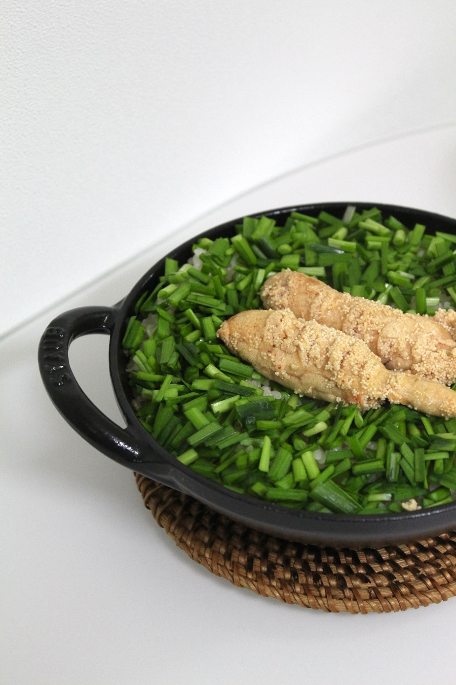 Receta Sencilla pero Elegante de ‘Arroz en Olla Staub con Huevas de Abadejo y Cebollino’