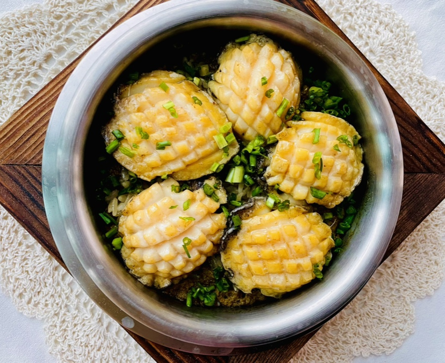 Una vez que el arroz esté cocido, coloca el abulón a la plancha de forma atractiva sobre el arroz. Tapa la olla y deja que repose al vapor durante unos 5 minutos. Después de reposar, espolvorea las cebolletas picadas sobre el arroz de abulón terminado para darle un toque de color. Sirve caliente con la salsa de soja sazonada preparada y disfruta mezclándola con el arroz.