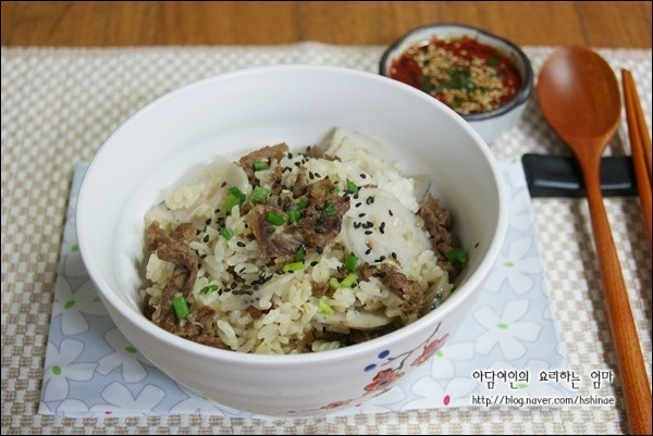Coloque la raíz de loto preparada y la res salteada de manera atractiva sobre el arroz. Colocar los ingredientes de manera hermosa realza el atractivo visual del plato. A medida que el arroz se cocina, los sabores de la carne y la raíz de loto se infusionarán en los granos.
