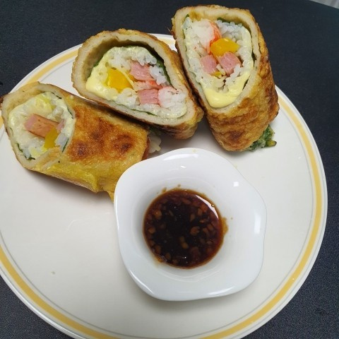 Arroz Enrollado de Pastel de Pescado con Salsa de Soja y Ajo