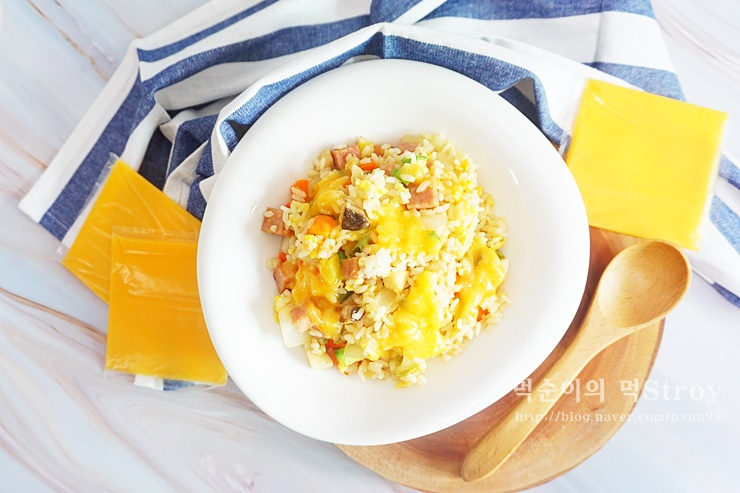 Ahora, añade 1 tazón de arroz cocido tibio y 2 lonchas de queso procesado Seoul Milk a la sartén. Rompe las lonchas de queso en trozos más pequeños antes de añadirlas. Tan pronto como toquen el calor, el queso comenzará a derretirse, liberando un aroma maravillosamente sabroso que te hará la boca agua al instante.