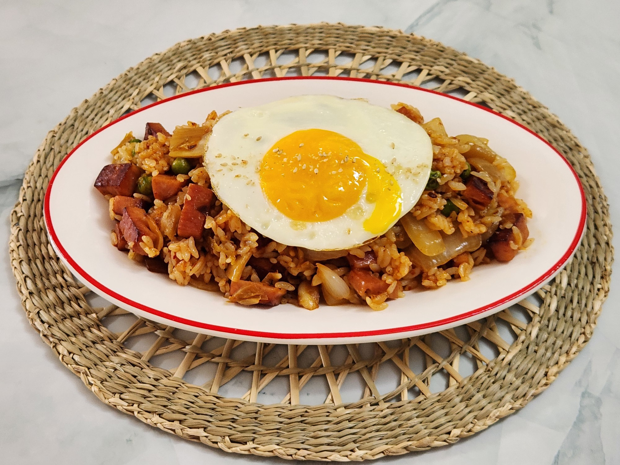 Sirve el arroz frito con Spam y Kimchi terminado en un plato. Cúbrelo con un huevo frito a la plancha con la yema a medio hacer. Rompe la yema y mézclala con el arroz frito para una experiencia increíblemente rica y satisfactoria. ¡Disfruta de tu deliciosa comida!